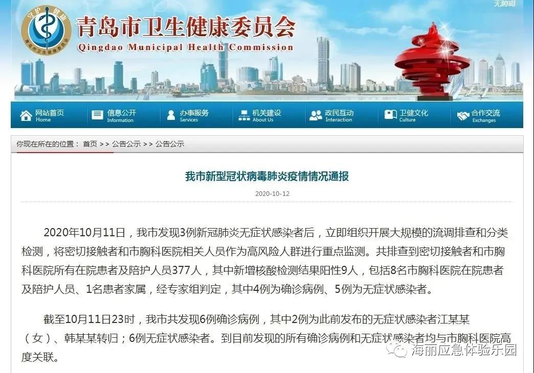 10月12日,青島市衛(wèi)健委通報該市新型冠狀病毒肺炎疫情情況。截至10月11日23時,青島市共發(fā)現(xiàn)6例確診病例,其中2例為此前發(fā)布的無癥狀感染者江某某(女)、韓某某轉(zhuǎn)歸;6例無癥狀感染者。到目前發(fā)現(xiàn)的所有確診病例和無癥狀感染者均與市胸科醫(yī)院高度關(guān)聯(lián)。