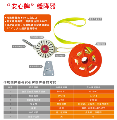 逃生緩降器/救生器主要用于火災(zāi)時外部救援無法到達(dá)或者不能及時到達(dá)情況下的高樓逃生救援。它具有使人體從高處沿繩索安全至地面的功能。充分考慮到火災(zāi)時逃生時間緊,逃生空間小,逃生處環(huán)境復(fù)雜,可能無幫手等特點。體積小,便攜帶,不用電,不借助外力,僅靠人體自重就可工作,完全可以一人快速自救逃生,并可實現(xiàn)勻速下落或者懸停的裝置。