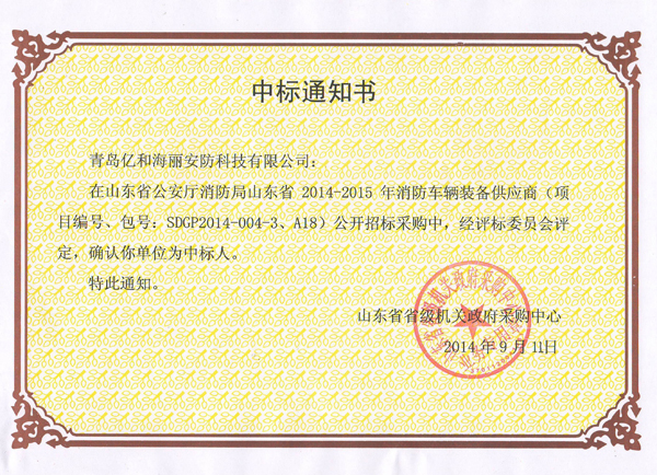 山東省省級機關政府采購中心就山東省2014-2015年消防器材裝備供應商項目在國內進行招標采購,經審定,億和海麗研發(fā)生產的安心牌消防輕型安全繩、安心牌消防通用安全繩完全符合要求,2014年9月評標委員會授予青島億和海麗安防科技有限公司為山東省公安廳消防局及所轄部隊提供中標產品的資格。