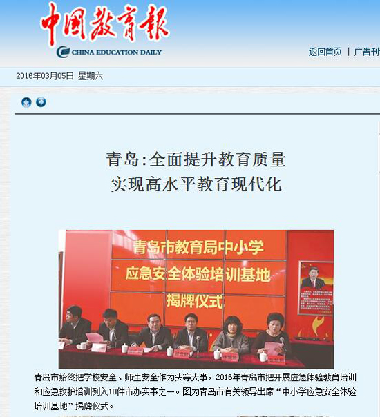 2016年青島市把開展中小學生應急體驗教育培訓和市民應急救護培訓列入10件市辦實事,未來海麗雅應急安全教育培訓中心將為更多的學生、百姓提供專業(yè)化應急安全教育培訓服務,為提升社會整體應急自救、互救技能水平貢獻力量。《中國教育報》關注青島市應急教育的發(fā)展,在全國“兩會”期間,第一時間將“青島市教育局中小學應急安全體驗培訓基地”落戶海麗雅應急安全教育培訓中心消息進行宣傳報道。