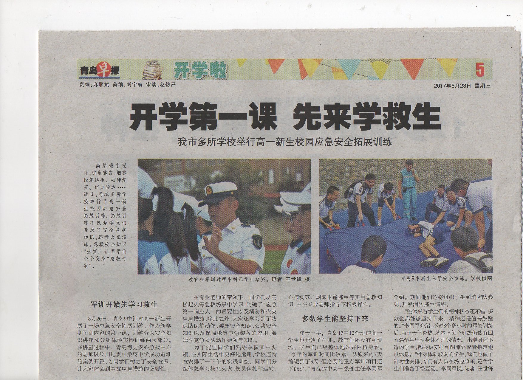 2017年8月23日,青島早報(bào)對(duì)海麗應(yīng)急安全中心為青島第九中學(xué)的新生及老師進(jìn)行培訓(xùn)活動(dòng)進(jìn)行報(bào)道