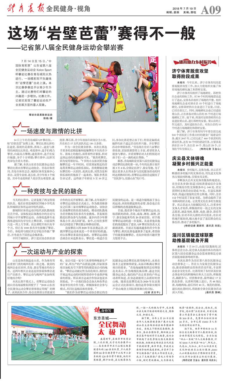 《體育晨報(bào)》以“這場(chǎng)巖壁芭蕾賽的不一般”為題,對(duì)公司研發(fā)生產(chǎn)的“蛟龍”動(dòng)力繩成為2018山東省全民健身運(yùn)動(dòng)會(huì)攀巖賽事唯一指定用繩等內(nèi)容進(jìn)行報(bào)道。