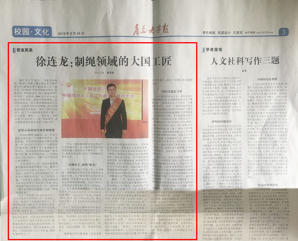 【青島大學(xué)報(bào)】以“徐連龍:制繩領(lǐng)域的大國(guó)工匠”為題,對(duì)徐連龍工匠精神進(jìn)行報(bào)道。