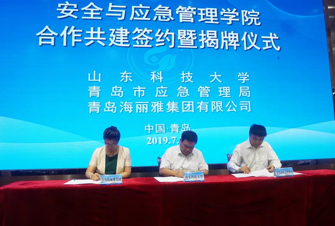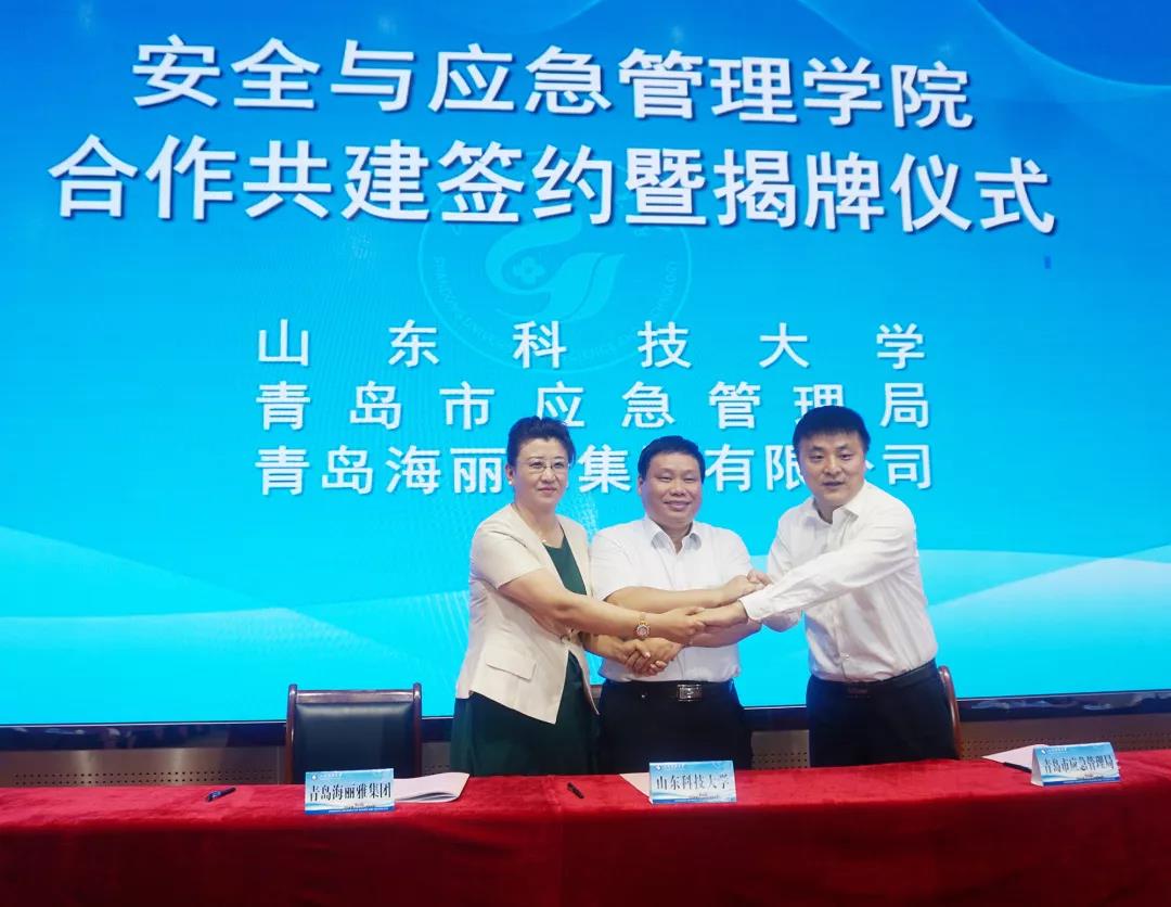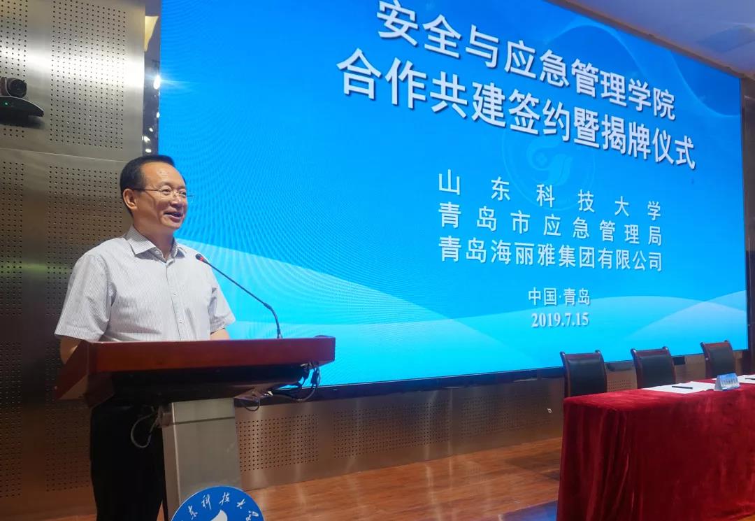2019年7月15日,山東科技大學、青島市應急管理局、青島海麗雅集團三方聯(lián)合共建的“安全與應急管理學院”舉行揭牌儀式。中央黨校(國家行政學院)應急管理培訓中心(中歐應急管理學院)主任(院長)/中國應急管理學會副會長馬寶成、山東科技大學黨委書記羅公利、 青島市政府副秘書長萬建忠、青島市應急管理局局長張建剛、青島海麗雅集團董事長張旭明出席會議。