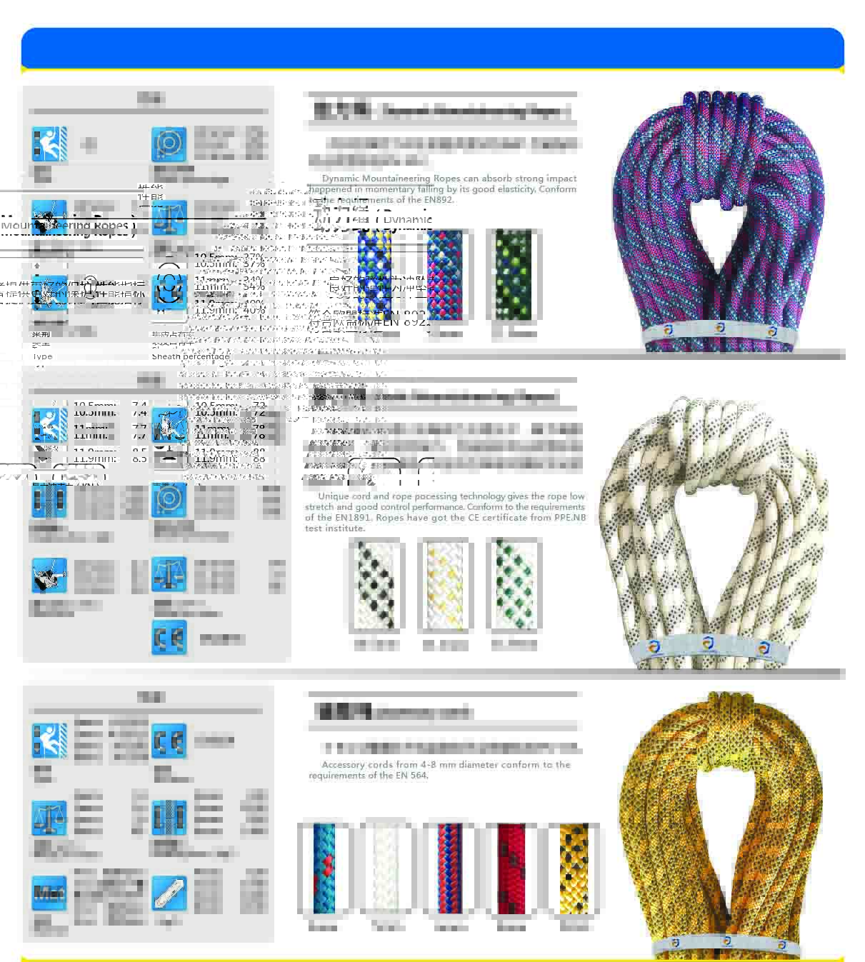 特殊繩芯處理以及繩體后處理技術(shù),賦予繩索低延展性,更好的控制力。性能指標(biāo)符合歐盟標(biāo)準(zhǔn)EN 1891。已經(jīng)獲得具有PPE指令的NB機構(gòu)測試發(fā)證的國際CE證書。