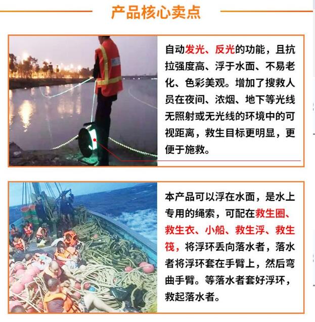 安心牌洪水救援時(shí)繩索抗拉強(qiáng)度高、漂浮于水面、不易老化、色彩美觀。增加了搜救人員在夜間、濃煙、地下等光線無照射或者無光線的環(huán)境中的可視距離,救生目標(biāo)更明顯,更便于施救。