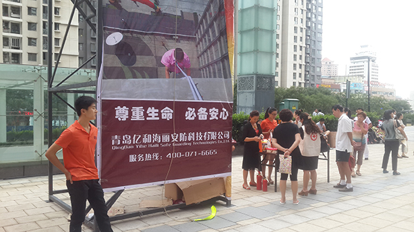 圖為億和海麗工作人員向活動(dòng)者演示災(zāi)難中如何自救