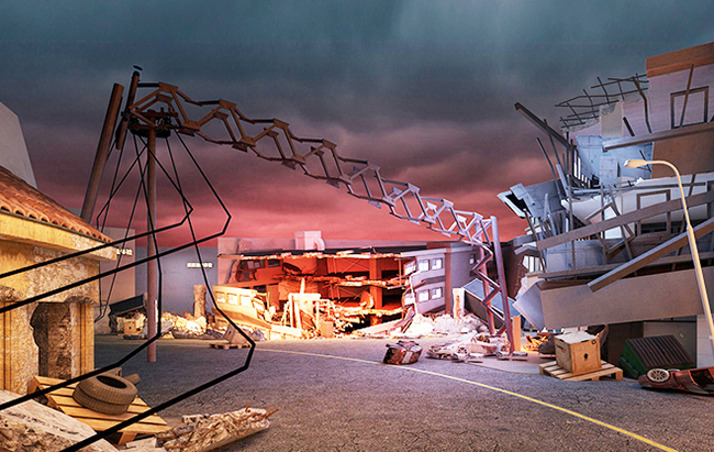 再現(xiàn)地震后,道路變形,有波浪狀也有斷裂上下錯(cuò)層的場景。在道路兩側(cè)有建筑物倒塌,形成通道。體驗(yàn)者從破損的通過穿過,到達(dá)一個(gè)相對安全的位置。在臨近出口處,設(shè)置一條斷掉的高壓電線掉落在地上,要求體驗(yàn)者此處應(yīng)該采取單腳跳的方式離開此區(qū)域。
