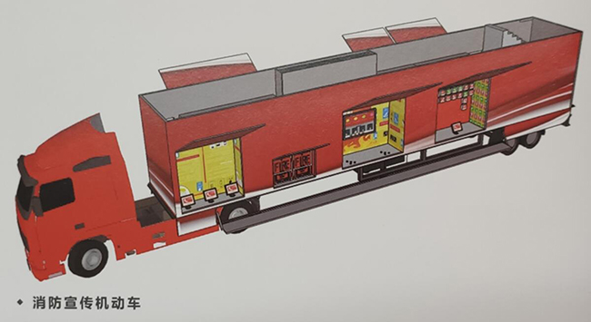 多功能消防宣傳車采用電動車輛底盤改裝,車身長12米,寬2.5米,高3.5米。整體車身以大紅色為背景色,噴繪有消防人物卡通漫畫、消防標識等圖文,色彩鮮艷奪目,具有很強的吸引力。車內(nèi)張貼有消防安全常識、常見消防標識、家庭消防五件寶、三懂三會、疏散指示標志等內(nèi)容,生動活潑、通俗易懂。